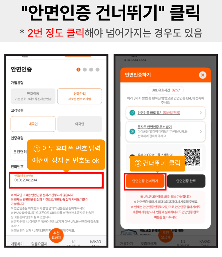 - ‘안면인증 건너뛰기’ 클릭 (2번 정도 클릭해야 넘어가지는 경우도 있음)