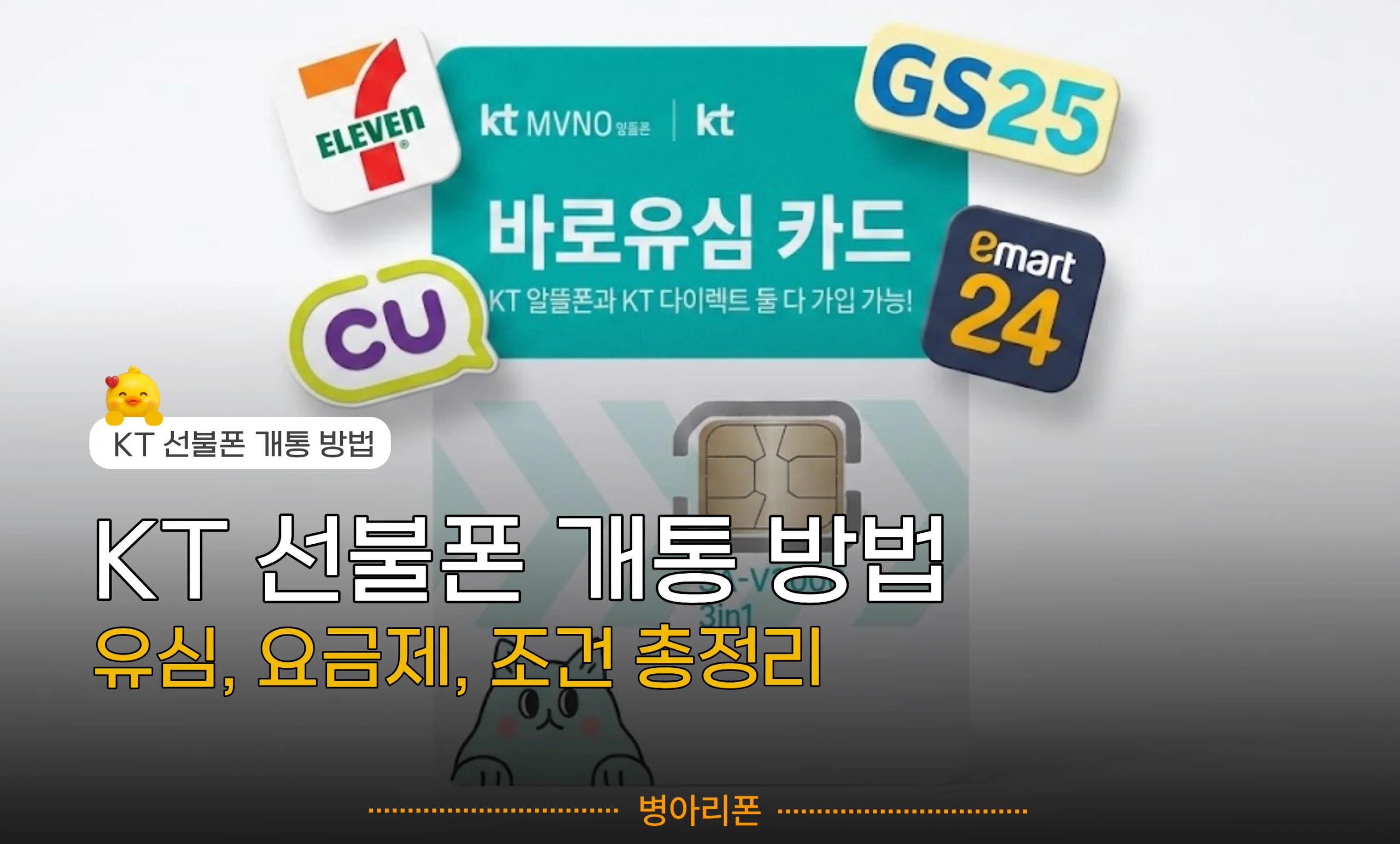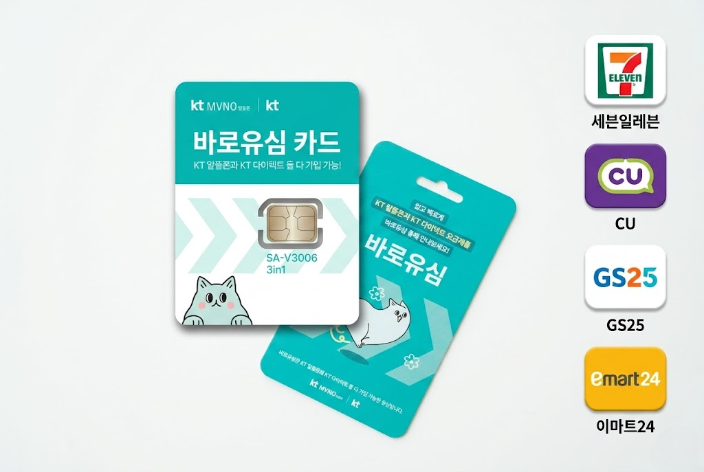 KT망은 바로유심 (민트색, 고양이 그림) – CU, GS25, emart24, 세븐일레븐에서 8,800원에 구입 가능해요.